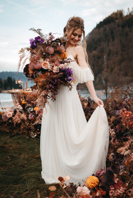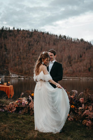 Switzerland is a beautiful country, and it's no surprise that many couples choose to elope here. This ceremony was not an exception: they got re married next to a breathtaking lake, surrounded by mountains and lush greenery. The location was peaceful and serene, providing the perfect backdrop for their intimate ceremony (frei trauung). The lake they chose for their elopement is near Zürich, only 40 minutes away, in the region of canton Schwyz. The lake is easy to access by car, no need to take a gondola, which makes it easier to bring in decorations and the beautiful setting that they had. The bride got ready by Flor Bustos, a professional make up artists and hairstylist specialised in elopements and weddings. The outstanding flower decorations were done by Stil und Stiele, a wonderful flower atelier from Zürich, that elaborates breathtaking flower arrangements. The dress was a piece of the handmade, haute couture brand Zolotas, coming from Greece, and being a beautiful boho add t add to any elopement in the mountains.